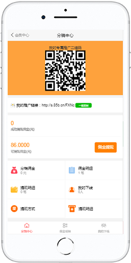 通过全民分销和指定分销方式,邀请微信好友下单赚取佣金,降低人工营销宣传成本,实现人人分享赚钱的乐趣,促进商城社交化推广